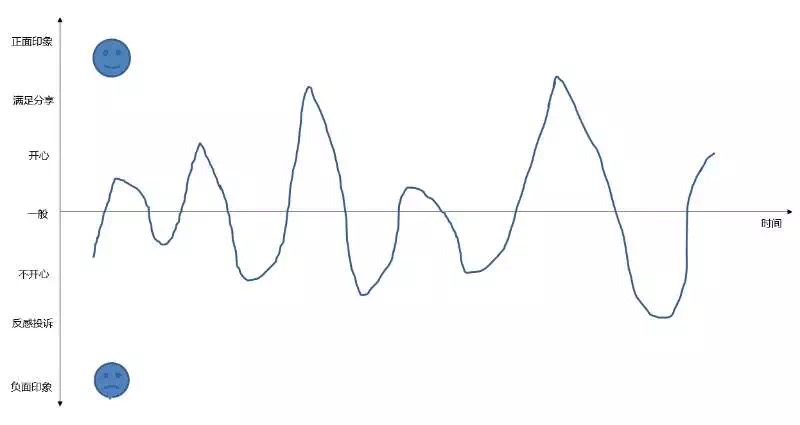 曲線是根據(jù)不同項(xiàng)目,不同群體的體驗(yàn)描繪出來。最頂端的波峰值得注意,如果是負(fù)向的峰比正向的峰還高,那這個(gè)體驗(yàn)最終是導(dǎo)向于負(fù)面印象的。